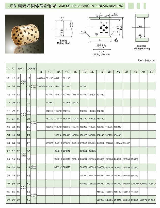JDB鑲嵌式固體潤(rùn)滑軸承尺寸表